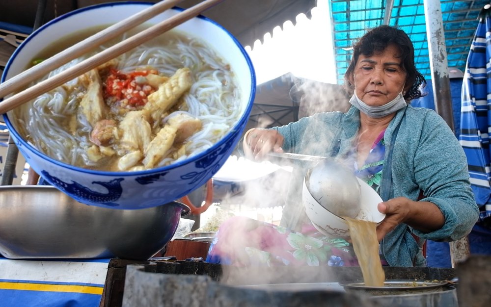 Cô chủ quán bún cá Rạch Giá thân thiện – hình ảnh gần gũi đặc trưng ẩm thực miền Tây. (Ảnh Báo lao động)
