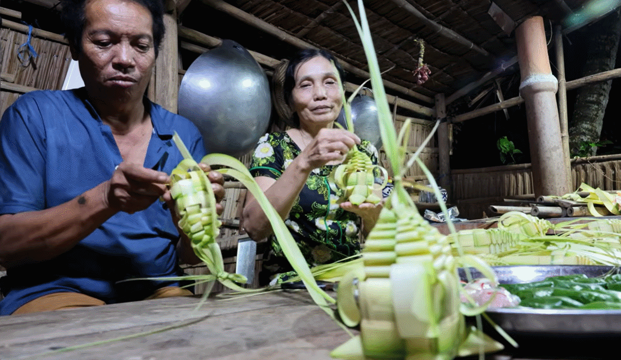 Chị kể, làm một chiếc nem lầu mất gần nửa ngày. Năm lá dừa chẻ đôi thành mười sợi, phải đan từ đáy lên đỉnh, sao cho tháp nhỏ dần mà vẫn vững. Khi hoàn thành, chỉ nhìn thôi cũng thấy tình yêu và sự kiên nhẫn gửi gắm trong từng nếp lá.