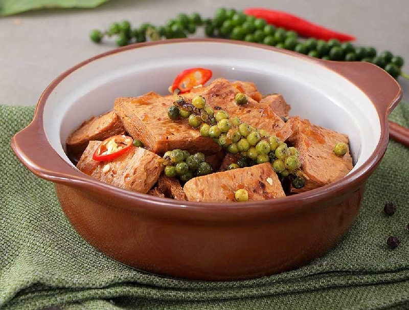 Đậu hũ cắt vuông, kho cùng tiêu và nước dừa, tạo nên món ăn dân dã, béo ngậy, đậm đà — rất được ưa chuộng trong bữa cơm chay miền Tây.